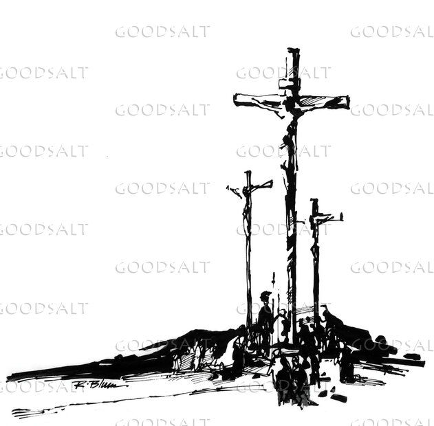 Christ on His cross. Thieves and crowd below. by Review & Herald Publishing