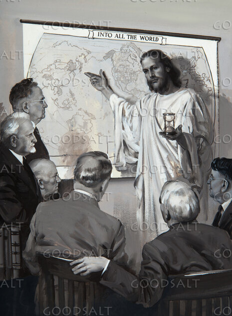 Jesus is standing by a wall map and pointing to an area on it, to 6 men in suits, sitting and standing, holding a timer of sand. by Review & Herald Publishing