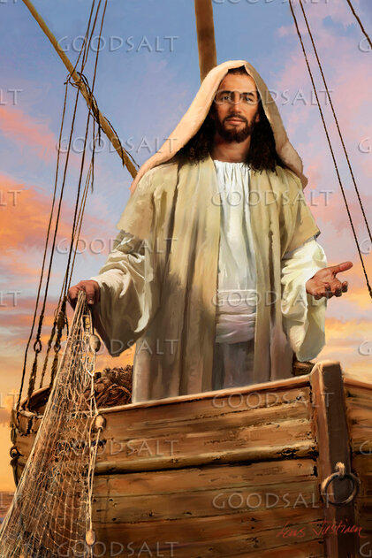 Jesus standing on a boat holding a fishing net inviting us to be a fishers of men by Lars Justinen