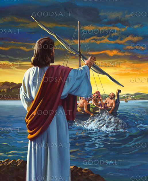 Jesus stands on the shore and advises disciples where to cast their nets by Review & Herald Publishing