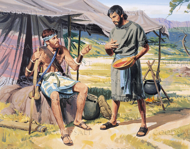 Jacob has found a golden opportunity to take Esau's birthright from him. Jacob is cooking some stew. His brother comes in from the field and is hungry. Quick-thinking Jacob decided the time is right. He exchanges food for the birthright. The con works and Esau is full, but without a birthright.