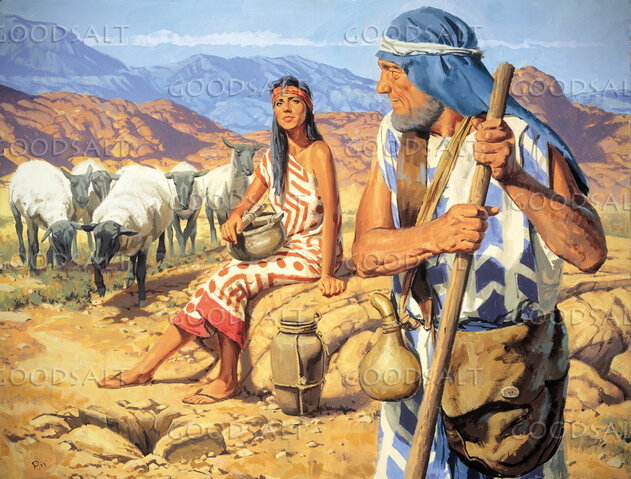 Genesis 291 Then Jacob went on his journey and came to the land of the people of the east.2 As he looked, he saw a well in the field, and behold, three flocks of sheep lying beside it, for out of that well the flocks were watered. The stone on the well's mouth was large,3 and when all the flocks were gathered there, the shepherds would roll the stone from the mouth of the well and water the sheep, and put the stone back in its place over the mouth of the well.4 Jacob said to them, “My brothers, where do you come from?” They said, “We are from Haran.”5 He said to them, “Do you know Laban the son of Nahor?” They said, “We know him.”6 He said to them, “Is it well with him?” They said, “It is well; and see, Rachel his daughter is coming with the sheep!”7 He said, “Behold, it is still high day; it is not time for the livestock to be gathered together. Water the sheep and go, pasture them.”8 But they said, “We cannot until all the flocks are gathered together and the stone is rolled from the mouth of the well; then we water the sheep.”9 While he was still speaking with them, Rachel came with her father's sheep, for she was a shepherdess.10 Now as soon as Jacob saw Rachel the daughter of Laban his mother's brother, and the sheep of Laban his mother's brother, Jacob came near and rolled the stone from the well's mouth and watered the flock of Laban his mother's brother.11 Then Jacob kissed Rachel and wept aloud.12 And Jacob told Rachel that he was her father's kinsman, and that he was Rebekah's son, and she ran and told her father.13 As soon as Laban heard the news about Jacob, his sister's son, he ran to meet him and embraced him and kissed him and brought him to his house. Jacob told Laban all these things,14 and Laban said to him, “Surely you are my bone and my flesh!” And he stayed with him a month.15 Then Laban said to Jacob, “Because you are my kinsman, should you therefore serve me for nothing? Tell me, what shall your wages be?”16 Now Laban had two daughters. The name of the older was Leah, and the name of the younger was Rachel.17 Leah's eyes were weak, but Rachel was beautiful in form and appearance.18 Jacob loved Rachel. And he said, “I will serve you seven years for your younger daughter Rachel.”19 Laban said, “It is better that I give her to you than that I should give her to any other man; stay with me.”20 So Jacob served seven years for Rachel, and they seemed to him but a few days because of the love he had for her.21 Then Jacob said to Laban, “Give me my wife that I may go in to her, for my time is completed.”22 So Laban gathered together all the people of the place and made a feast.23 But in the evening he took his daughter Leah and brought her to Jacob, and he went in to her.24 (Laban gave his female servant Zilpah to his daughter Leah to be her servant.)25 And in the morning, behold, it was Leah! And Jacob said to Laban, “What is this you have done to me? Did I not serve with you for Rachel? Why then have you deceived me?”26 Laban said, “It is not so done in our country, to give the younger before the firstborn.27 Complete the week of this one, and we will give you the other also in return for serving me another seven years.”28 Jacob did so, and completed her week. Then Laban gave him his daughter Rachel to be his wife.29 (Laban gave his female servant Bilhah to his daughter Rachel to be her servant.)30 So Jacob went in to Rachel also, and he loved Rachel more than Leah, and served Laban for another seven years.31 When the LORD saw that Leah was hated, he opened her womb, but Rachel was barren.32 And Leah conceived and bore a son, and she called his name Reuben, for she said, “Because the LORD has looked upon my affliction; for now my husband will love me.”33 She conceived again and bore a son, and said, “Because the LORD has heard that I am hated, he has given me this son also.” And she called his name Simeon.34 Again she conceived and bore a son, and said, “Now this time my husband will be attached to me, because I have borne him three sons.” Therefore his name was called Levi.35 And she conceived again and bore a son, and said, “This time I will praise the LORD.” Therefore she called his name Judah. Then she ceased bearing. | |