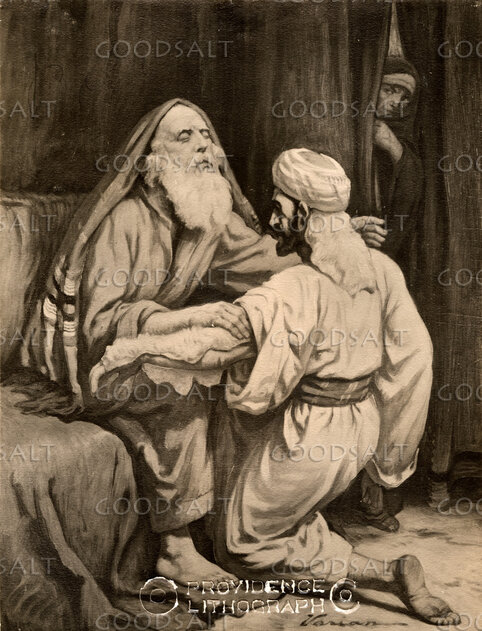 Genesis 271 When Isaac was old and his eyes were dim so that he could not see, he called Esau his older son and said to him, “My son”; and he answered, “Here I am.”2 He said, “Behold, I am old; I do not know the day of my death.3 Now then, take your weapons, your quiver and your bow, and go out to the field and hunt game for me,4 and prepare for me delicious food, such as I love, and bring it to me so that I may eat, that my soul may bless you before I die.”5 Now Rebekah was listening when Isaac spoke to his son Esau. So when Esau went to the field to hunt for game and bring it,6 Rebekah said to her son Jacob, “I heard your father speak to your brother Esau,7 ‘Bring me game and prepare for me delicious food, that I may eat it and bless you before the LORD before I die.’8 Now therefore, my son, obey my voice as I command you.9 Go to the flock and bring me two good young goats, so that I may prepare from them delicious food for your father, such as he loves.10 And you shall bring it to your father to eat, so that he may bless you before he dies.”11 But Jacob said to Rebekah his mother, “Behold, my brother Esau is a hairy man, and I am a smooth man.12 Perhaps my father will feel me, and I shall seem to be mocking him and bring a curse upon myself and not a blessing.”13 His mother said to him, “Let your curse be on me, my son; only obey my voice, and go, bring them to me.”14 So he went and took them and brought them to his mother, and his mother prepared delicious food, such as his father loved.15 Then Rebekah took the best garments of Esau her older son, which were with her in the house, and put them on Jacob her younger son.16 And the skins of the young goats she put on his hands and on the smooth part of his neck.17 And she put the delicious food and the bread, which she had prepared, into the hand of her son Jacob.18 So he went in to his father and said, “My father.” And he said, “Here I am. Who are you, my son?”19 Jacob said to his father, “I am Esau your firstborn. I have done as you told me; now sit up and eat of my game, that your soul may bless me.”20 But Isaac said to his son, “How is it that you have found it so quickly, my son?” He answered, “Because the LORD your God granted me success.”21 Then Isaac said to Jacob, “Please come near, that I may feel you, my son, to know whether you are really my son Esau or not.”22 So Jacob went near to Isaac his father, who felt him and said, “The voice is Jacob's voice, but the hands are the hands of Esau.”23 And he did not recognize him, because his hands were hairy like his brother Esau's hands. So he blessed him.24 He said, “Are you really my son Esau?” He answered, “I am.”25 Then he said, “Bring it near to me, that I may eat of my son's game and bless you.” So he brought it near to him, and he ate; and he brought him wine, and he drank.26 Then his father Isaac said to him, “Come near and kiss me, my son.”27 So he came near and kissed him. And Isaac smelled the smell of his garments and blessed him and said, “See, the smell of my son is as the smell of a field that the LORD has blessed!28 May God give you of the dew of heaven and of the fatness of the earth and plenty of grain and wine.29 Let peoples serve you, and nations bow down to you. Be lord over your brothers, and may your mother's sons bow down to you. Cursed be everyone who curses you, and blessed be everyone who blesses you!”30 As soon as Isaac had finished blessing Jacob, when Jacob had scarcely gone out from the presence of Isaac his father, Esau his brother came in from his hunting.31 He also prepared delicious food and brought it to his father. And he said to his father, “Let my father arise and eat of his son's game, that you may bless me.”32 His father Isaac said to him, “Who are you?” He answered, “I am your son, your firstborn, Esau.”33 Then Isaac trembled very violently and said, “Who was it then that hunted game and brought it to me, and I ate it all before you came, and I have blessed him? Yes, and he shall be blessed.”34 As soon as Esau heard the words of his father, he cried out with an exceedingly great and bitter cry and said to his father, “Bless me, even me also, O my father!”35 But he said, “Your brother came deceitfully, and he has taken away your blessing.”36 Esau said, “Is he not rightly named Jacob? For he has cheated me these two times. He took away my birthright, and behold, now he has taken away my blessing.” Then he said, “Have you not reserved a blessing for me?”37 Isaac answered and said to Esau, “Behold, I have made him lord over you, and all his brothers I have given to him for servants, and with grain and wine I have sustained him. What then can I do for you, my son?”38 Esau said to his father, “Have you but one blessing, my father? Bless me, even me also, O my father.” And Esau lifted up his voice and wept.39 Then Isaac his father answered and said to him: “Behold, away from the fatness of the earth shall your dwelling be, and away from the dew of heaven on high.40 By your sword you shall live, and you shall serve your brother; but when you grow restless you shall break his yoke from your neck.”41 Now Esau hated Jacob because of the blessing with which his father had blessed him, and Esau said to himself, “The days of mourning for my father are approaching; then I will kill my brother Jacob.”42 But the words of Esau her older son were told to Rebekah. So she sent and called Jacob her younger son and said to him, “Behold, your brother Esau comforts himself about you by planning to kill you.43 Now therefore, my son, obey my voice. Arise, flee to Laban my brother in Haran44 and stay with him a while, until your brother's fury turns away—45 until your brother's anger turns away from you, and he forgets what you have done to him. Then I will send and bring you from there. Why should I be bereft of you both in one day?”46 Then 