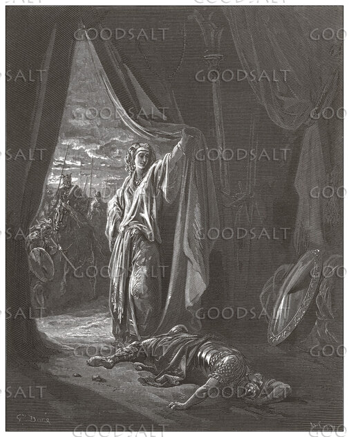 21 But Jael the wife of Heber took a tent peg, and took a hammer in her hand. Then she went softly to him and drove the peg into his temple until it went down into the ground while he was lying fast asleep from weariness. So he died.