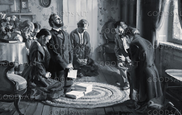 black and white. Ellen White and believers kneeling and praying in living room. manuscript. Harry Anderson. by Review & Herald Publishing