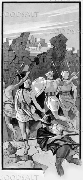 Israelite soldiers invade Jericho after the walls crumble. by Review & Herald Publishing