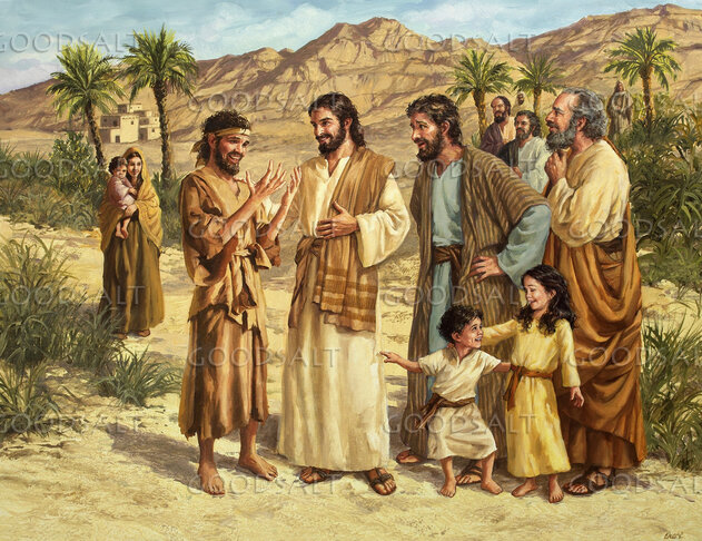 On a road outside of Jericho, Jesus and Bartimaeus are standing after Jesus has healed Bartimaeus. Bartimaeus is holding up his hands and looking at them in amazement.