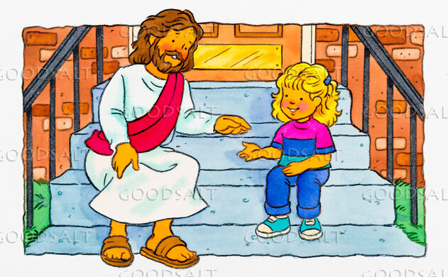 Jesus sitting on door stoop talking with modern day little girl. by Mary Rumford