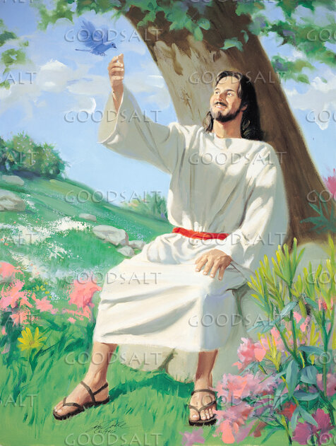 Jesus is sitting on a rock in front of a tree. His let hand is extended and a bluebird in flight appears to be getting ready to rest on His finger. by Lifeway Collection