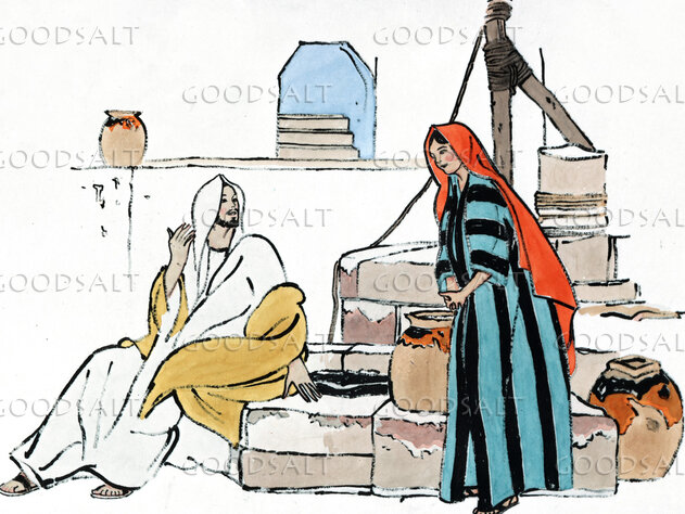 John 44 And he had to pass through Samaria.5 So he came to a town of Samaria called Sychar, near the field that Jacob had given to his son Joseph.6 Jacob's well was there; so Jesus, wearied as he was from his journey, was sitting beside the well. It was about the sixth hour.7 A woman from Samaria came to draw water. Jesus said to her, “Give me a drink.”8 (For his disciples had gone away into the city to buy food.)9 The Samaritan woman said to him, “How is it that you, a Jew, ask for a drink from me, a woman of Samaria?” (For Jews have no dealings with Samaritans.)10 Jesus answered her, “If you knew the gift of God, and who it is that is saying to you, ‘Give me a drink,’ you would have asked him, and he would have given you living water.”11 The woman said to him, “Sir, you have nothing to draw water with, and the well is deep. Where do you get that living water?12 Are you greater than our father Jacob? He gave us the well and drank from it himself, as did his sons and his livestock.”13 Jesus said to her, “Everyone who drinks of this water will be thirsty again,14 but whoever drinks of the water that I will give him will never be thirsty again. The water that I will give him will become in him a spring of water welling up to eternal life.”15 The woman said to him, “Sir, give me this water, so that I will not be thirsty or have to come here to draw water.”16 Jesus said to her, “Go, call your husband, and come here.”17 The woman answered him, “I have no husband.” Jesus said to her, “You are right in saying, ‘I have no husband’;18 for you have had five husbands, and the one you now have is not your husband. What you have said is true.”19 The woman said to him, “Sir, I perceive that you are a prophet.20 Our fathers worshiped on this mountain, but you say that in Jerusalem is the place where people ought to worship.”21 Jesus said to her, “Woman, believe me, the hour is coming when neither on this mountain nor in Jerusalem will you worship the Father.22 You worship what you do not know; we worship what we know, for salvation is from the Jews.23 But the hour is coming, and is now here, when the true worshipers will worship the Father in spirit and truth, for the Father is seeking such people to worship him.24 God is spirit, and those who worship him must worship in spirit and truth.”25 The woman said to him, “I know that Messiah is coming (he who is called Christ). When he comes, he will tell us all things.”26 Jesus said to her, “I who speak to you am he.”27 Just then his disciples came back. They marveled that he was talking with a woman, but no one said, “What do you seek?” or, “Why are you talking with her?”28 So the woman left her water jar and went away into town and said to the people,29 “Come, see a man who told me all that I ever did. Can this be the Christ?”30 They went out of the town and were coming to him.31 Meanwhile the disciples were urging him, saying, “Rabbi, eat.”32 But he said to them, “I have food to eat that you do not know about.”33 So the disciples said to one another, “Has anyone brought him something to eat?”34 Jesus said to them, “My food is to do the will of him who sent me and to accomplish his work.35 Do you not say, ‘There are yet four months, then comes the harvest’? Look, I tell you, lift up your eyes, and see that the fields are white for harvest.36 Already the one who reaps is receiving wages and gathering fruit for eternal life, so that sower and reaper may rejoice together.37 For here the saying holds true, ‘One sows and another reaps.’38 I sent you to reap that for which you did not labor. Others have labored, and you have entered into their labor.”39 Many Samaritans from that town believed in him because of the woman's testimony, “He told me all that I ever did.”40 So when the Samaritans came to him, they asked him to stay with them, and he stayed there two days.41 And many more believed because of his word.42 They said to the woman, “It is no longer because of what you said that we believe, for we have heard for ourselves, and we know that this is indeed the Savior of the world.” | |