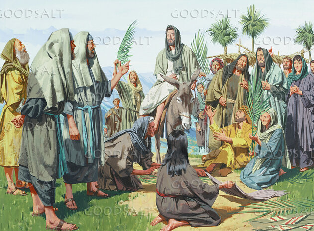 Jesus is riding on a cloak-clad colt. Others making their way along the road are Pharisees, the crowd, and Jesus' disciples. by Lifeway Collection