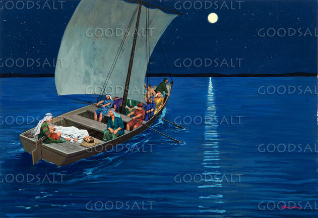 Jesus sleeps in the back of the boat as his disciples travel across the Sea of Galilee on a calm night. Part of a series. by Review & Herald Publishing