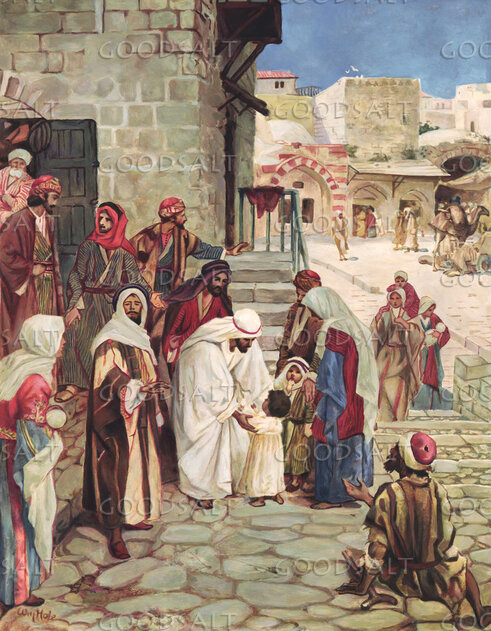 Luke 1815 Now they were bringing even infants to him that he might touch them. And when the disciples saw it, they rebuked them.16 But Jesus called them to him, saying, “Let the children come to me, and do not hinder them, for to such belongs the kingdom of God.17 Truly, I say to you, whoever does not receive the kingdom of God like a child shall not enter it.” Mark 1013 And they were bringing children to him that he might touch them, and the disciples rebuked them.14 But when Jesus saw it, he was indignant and said to them, “Let the children come to me; do not hinder them, for to such belongs the kingdom of God.15 Truly, I say to you, whoever does not receive the kingdom of God like a child shall not enter it.”16 And he took them in his arms and blessed them, laying his hands on them. Matthew 1913 Then children were brought to him that he might lay his hands on them and pray. The disciples rebuked the people,14 but Jesus said, “Let the little children come to me and do not hinder them, for to such belongs the kingdom of heaven.”15 And he laid his hands on them and went away. | |
