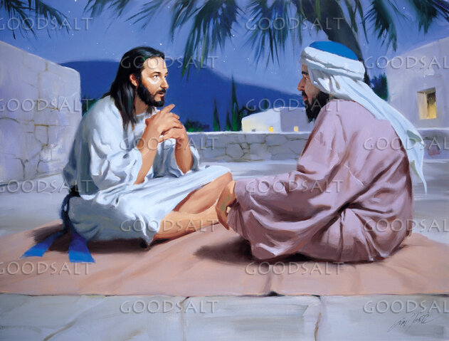 Jesus and Nicodemus are sitting on the floor of a roof talking. by Lifeway Collection