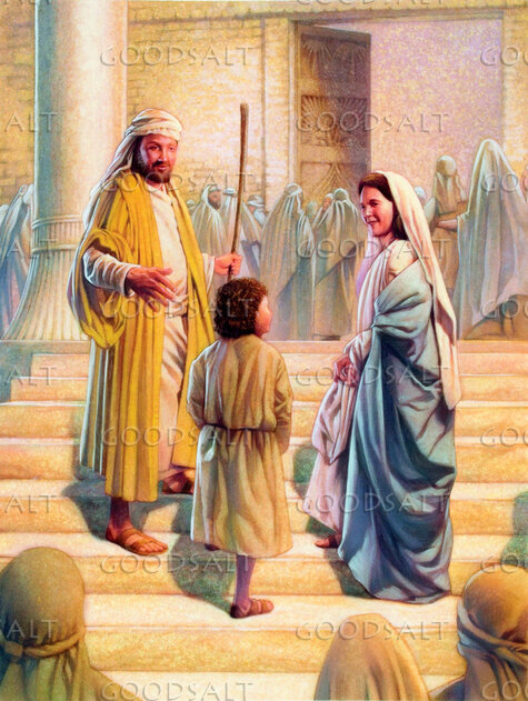 Jesus, Mary, and Joseph are walking up the steps at the entrance to the temple in Jerusalem. by Lifeway Collection
