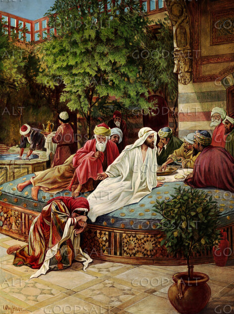 Luke 736 One of the Pharisees asked him to eat with him, and he went into the Pharisee's house and took his place at the table.37 And behold, a woman of the city, who was a sinner, when she learned that he was reclining at table in the Pharisee's house, brought an alabaster flask of ointment,38 and standing behind him at his feet, weeping, she began to wet his feet with her tears and wiped them with the hair of her head and kissed his feet and anointed them with the ointment.39 Now when the Pharisee who had invited him saw this, he said to himself, “If this man were a prophet, he would have known who and what sort of woman this is who is touching him, for she is a sinner.”40 And Jesus answering said to him, “Simon, I have something to say to you.” And he answered, “Say it, Teacher.”41 “A certain moneylender had two debtors. One owed five hundred denarii, and the other fifty.42 When they could not pay, he cancelled the debt of both. Now which of them will love him more?”43 Simon answered, “The one, I suppose, for whom he cancelled the larger debt.” And he said to him, “You have judged rightly.”44 Then turning toward the woman he said to Simon, “Do you see this woman? I entered your house; you gave me no water for my feet, but she has wet my feet with her tears and wiped them with her hair.45 You gave me no kiss, but from the time I came in she has not ceased to kiss my feet.46 You did not anoint my head with oil, but she has anointed my feet with ointment.47 Therefore I tell you, her sins, which are many, are forgiven—for she loved much. But he who is forgiven little, loves little.”48 And he said to her, “Your sins are forgiven.”49 Then those who were at table with him began to say among themselves, “Who is this, who even forgives sins?”50 And he said to the woman, “Your faith has saved you; go in peace.” | |