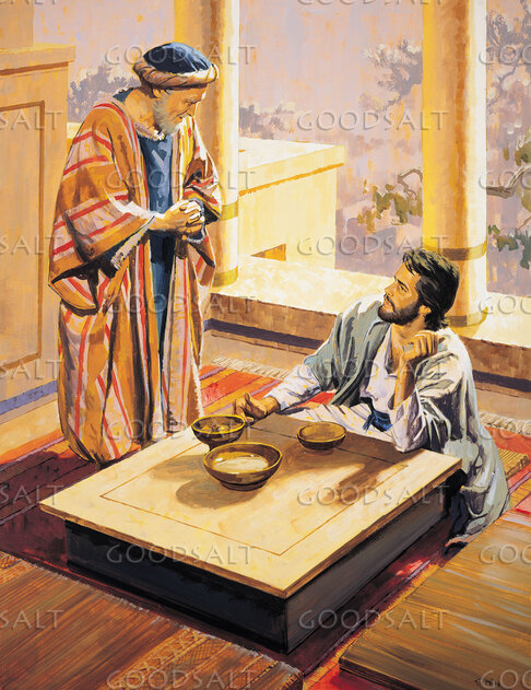 Jesus is at a table with Zacchaeus. Zacchaeus is standing looking at Jesus. Zacchaeus has just promised to pay back those whom he had cheated. Jesus looks at him and pronounces that salvation has come to the house. by Lifeway Collection