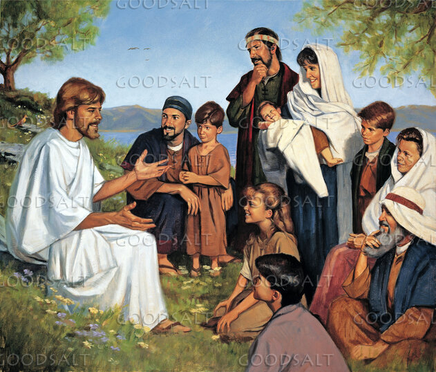 Adult Jesus, dressed in white, is sitting on a grassy hillside. He appears to be teaching the group of adults and children who are focused on Him. In the background is a body of water with mountains and trees. by Lifeway Collection