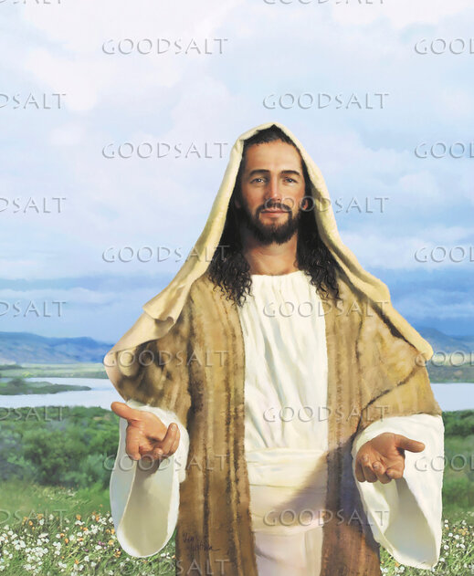 Jesus standing in a field and holding out his hands. by Lars Justinen