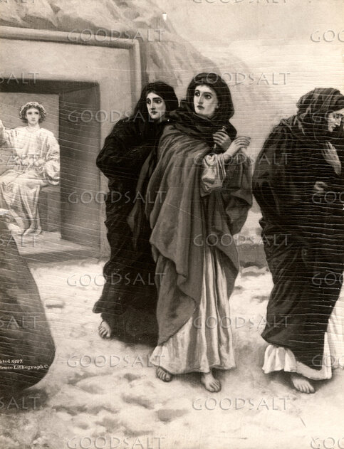 John 2011 But Mary stood weeping outside the tomb, and as she wept she stooped to look into the tomb.12 And she saw two angels in white, sitting where the body of Jesus had lain, one at the head and one at the feet.13 They said to her, “Woman, why are you weeping?” She said to them, “They have taken away my Lord, and I do not know where they have laid him.” Luke 241 But on the first day of the week, at early dawn, they went to the tomb, taking the spices they had prepared.2 And they found the stone rolled away from the tomb,3 but when they went in they did not find the body of the Lord Jesus.4 While they were perplexed about this, behold, two men stood by them in dazzling apparel.5 And as they were frightened and bowed their faces to the ground, the men said to them, “Why do you seek the living among the dead?6 He is not here, but has risen. Remember how he told you, while he was still in Galilee,7 that the Son of Man must be delivered into the hands of sinful men and be crucified and on the third day rise.”8 And they remembered his words, Mark 161 When the Sabbath was past, Mary Magdalene and Mary the mother of James and Salome bought spices, so that they might go and anoint him.2 And very early on the first day of the week, when the sun had risen, they went to the tomb.3 And they were saying to one another, “Who will roll away the stone for us from the entrance of the tomb?”4 And looking up, they saw that the stone had been rolled back—it was very large.5 And entering the tomb, they saw a young man sitting on the right side, dressed in a white robe, and they were alarmed.6 And he said to them, “Do not be alarmed. You seek Jesus of Nazareth, who was crucified. He has risen; he is not here. See the place where they laid him.7 But go, tell his disciples and Peter that he is going before you to Galilee. There you will see him, just as he told you.” Matthew 281 Now after the Sabbath, toward the dawn of the first day of the week, Mary Magdalene and the other Mary went to see the tomb.2 And behold, there was a great earthquake, for an angel of the Lord descended from heaven and came and rolled back the stone and sat on it.3 His appearance was like lightning, and his clothing white as snow.4 And for fear of him the guards trembled and became like dead men.5 But the angel said to the women, “Do not be afraid, for I know that you seek Jesus who was crucified.6 He is not here, for he has risen, as he said. Come, see the place where he lay.7 Then go quickly and tell his disciples that he has risen from the dead, and behold, he is going before you to Galilee; there you will see him. See, I have told you.” | |