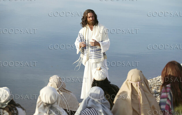 Jesus preaching to a crowd with the ocean in the background. by Erik Stenbakken