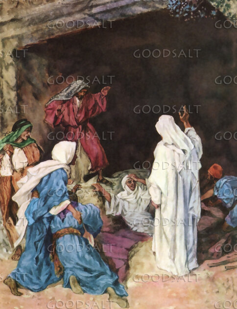 John 111 Now a certain man was ill, Lazarus of Bethany, the village of Mary and her sister Martha.2 It was Mary who anointed the Lord with ointment and wiped his feet with her hair, whose brother Lazarus was ill.3 So the sisters sent to him, saying, “Lord, he whom you love is ill.”4 But when Jesus heard it he said, “This illness does not lead to death. It is for the glory of God, so that the Son of God may be glorified through it.”5 Now Jesus loved Martha and her sister and Lazarus.6 So, when he heard that Lazarus was ill, he stayed two days longer in the place where he was.7 Then after this he said to the disciples, “Let us go to Judea again.”8 The disciples said to him, “Rabbi, the Jews were just now seeking to stone you, and are you going there again?”9 Jesus answered, “Are there not twelve hours in the day? If anyone walks in the day, he does not stumble, because he sees the light of this world.10 But if anyone walks in the night, he stumbles, because the light is not in him.”11 After saying these things, he said to them, “Our friend Lazarus has fallen asleep, but I go to awaken him.”12 The disciples said to him, “Lord, if he has fallen asleep, he will recover.”13 Now Jesus had spoken of his death, but they thought that he meant taking rest in sleep.14 Then Jesus told them plainly, “Lazarus has died,15 and for your sake I am glad that I was not there, so that you may believe. But let us go to him.”16 So Thomas, called the Twin, said to his fellow disciples, “Let us also go, that we may die with him.”17 Now when Jesus came, he found that Lazarus had already been in the tomb four days.18 Bethany was near Jerusalem, about two miles off,19 and many of the Jews had come to Martha and Mary to console them concerning their brother.20 So when Martha heard that Jesus was coming, she went and met him, but Mary remained seated in the house.21 Martha said to Jesus, “Lord, if you had been here, my brother would not have died.22 But even now I know that whatever you ask from God, God will give you.”23 Jesus said to her, “Your brother will rise again.”24 Martha said to him, “I know that he will rise again in the resurrection on the last day.”25 Jesus said to her, “I am the resurrection and the life. Whoever believes in me, though he die, yet shall he live,26 and everyone who lives and believes in me shall never die. Do you believe this?”27 She said to him, “Yes, Lord; I believe that you are the Christ, the Son of God, who is coming into the world.”28 When she had said this, she went and called her sister Mary, saying in private, “The Teacher is here and is calling for you.”29 And when she heard it, she rose quickly and went to him.30 Now Jesus had not yet come into the village, but was still in the place where Martha had met him.31 When the Jews who were with her in the house, consoling her, saw Mary rise quickly and go out, they followed her, supposing that she was going to the tomb to weep there.32 Now when Mary came to where Jesus was and saw him, she fell at his feet, saying to him, “Lord, if you had been here, my brother would not have died.”33 When Jesus saw her weeping, and the Jews who had come with her also weeping, he was deeply moved in his spirit and greatly troubled.34 And he said, “Where have you laid him?” They said to him, “Lord, come and see.”35 Jesus wept.36 So the Jews said, “See how he loved him!”37 But some of them said, “Could not he who opened the eyes of the blind man also have kept this man from dying?”38 Then Jesus, deeply moved again, came to the tomb. It was a cave, and a stone lay against it.39 Jesus said, “Take away the stone.” Martha, the sister of the dead man, said to him, “Lord, by this time there will be an odor, for he has been dead four days.”40 Jesus said to her, “Did I not tell you that if you believed you would see the glory of God?”41 So they took away the stone. And Jesus lifted up his eyes and said, “Father, I thank you that you have heard me.42 I knew that you always hear me, but I said this on account of the people standing around, that they may believe that you sent me.”43 When he had said these things, he cried out with a loud voice, “Lazarus, come out.”44 The man who had died came out, his hands and feet bound with linen strips, and his face wrapped with a cloth. Jesus said to them, “Unbind him, and let him go.”45 Many of the Jews therefore, who had come with Mary and had seen what he did, believed in him,46 but some of them went to the Pharisees and told them what Jesus had done.47 So the chief priests and the Pharisees gathered the Council and said, “What are we to do? For this man performs many signs.48 If we let him go on like this, everyone will believe in him, and the Romans will come and take away both our place and our nation.”49 But one of them, Caiaphas, who was high priest that year, said to them, “You know nothing at all.50 Nor do you understand that it is better for you that one man should die for the people, not that the whole nation should perish.”51 He did not say this of his own accord, but being high priest that year he prophesied that Jesus would die for the nation,52 and not for the nation only, but also to gather into one the children of God who are scattered abroad.53 So from that day on they made plans to put him to death.54 Jesus therefore no longer walked openly among the Jews, but went from there to the region near the wilderness, to a town called Ephraim, and there he stayed with the disciples. | |