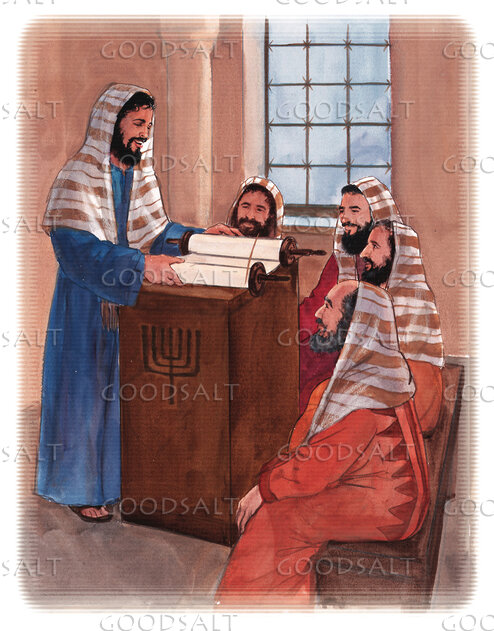 Jesus is standing behind a podium in a temple setting. The podium has a menorah engraved on the side, and there is a scroll with elaborate wooden handles resting on top. Jesus is reading from the scroll to the four men seated on a bench in front of the podium. All of the men appear to be Jewish and are dressed in dark tunics; have dark, curly hair and beards; and have similar head coverings.