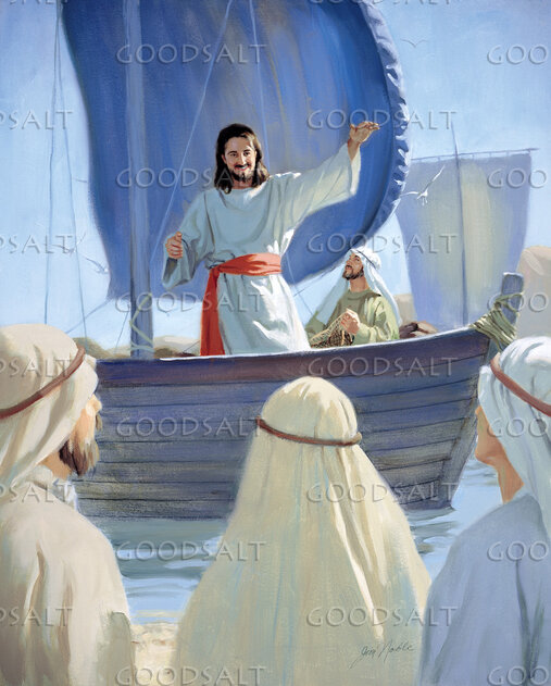 Jesus is standing in a boat hand uplifted. There is a man in the boat with him. He is facing toward a group of men on the shore. by Lifeway Collection