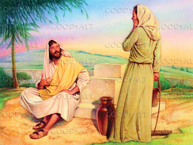 Set in the evening, a woman and Jesus are talking beside a well. by Lifeway Collection