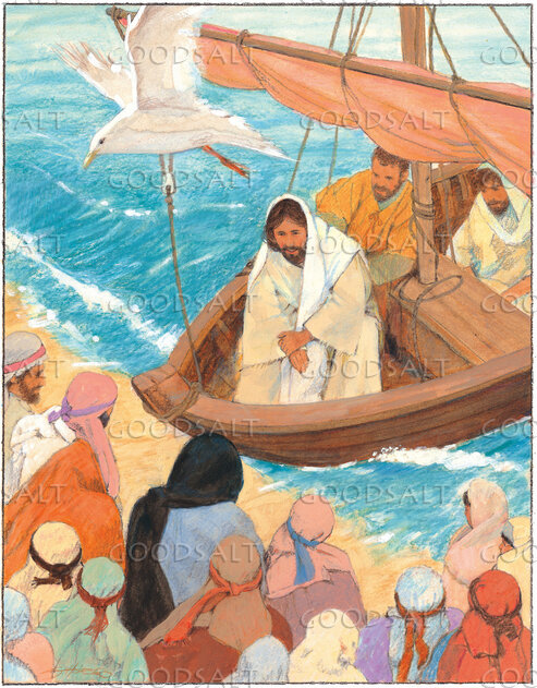 Jesus is sitting in a boat that is near the shore. There are two other men in te boat with Him. A crowd of people have gathered on the shore, facing Jesus. He is teaching them from the boat.