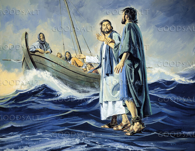 Jesus and Peter are both walking on the water toward the other disciples who are in the boat. by Lifeway Collection