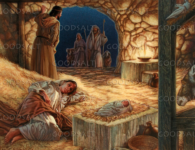 Joseph stands guard at the door of the stable while Mary rests on a bed of hay beside the babe in the manger. Two shepherds and their sheep are approaching the stable door. Joseph looks as though he is greeting them.