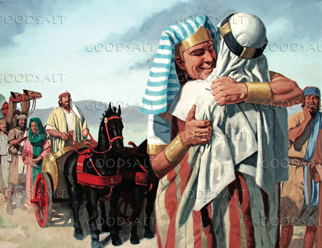 This painting is one of a new series that shows the same Joseph at different stages of his life (T-863 and T-871-874). This particular painting shows Joseph in his late 30's, greeting his brothers and his father, who is now quite old. He has brought his entire family to live near him in Egypt.
