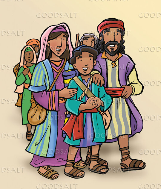 The boy Jesus, age twelve and his parents Mary and Joseph are on their way to Jerusalem to celebrate the Feast of the Passover. by Kim Justinen