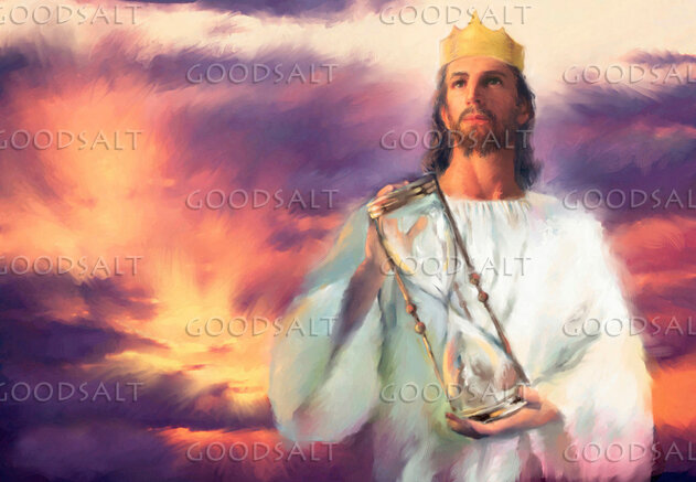 Jesus the king wearing crown of gold holding hourglass by Lars Justinen