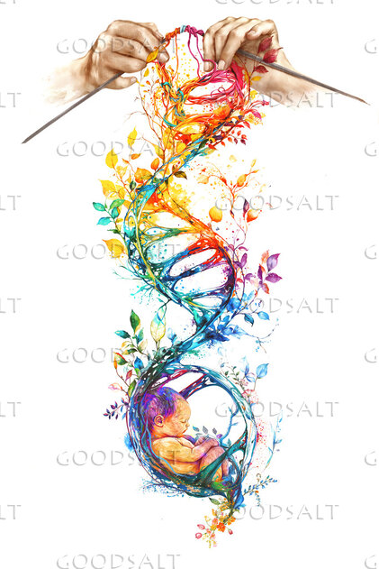 An illustration of God knitting a baby in the womb.