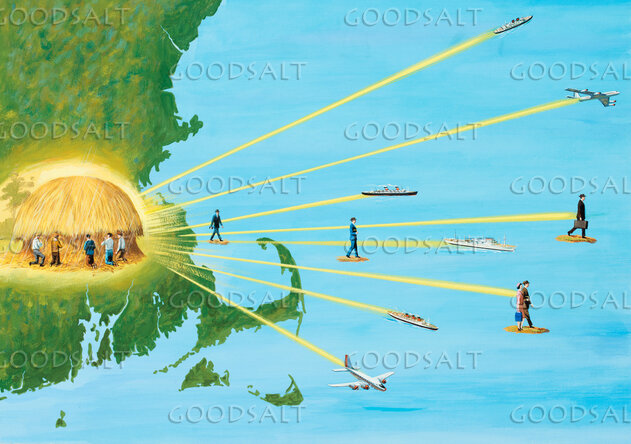 Vintage painting of missionaries praying for a harvest, then going out to gather it. by Review & Herald Publishing