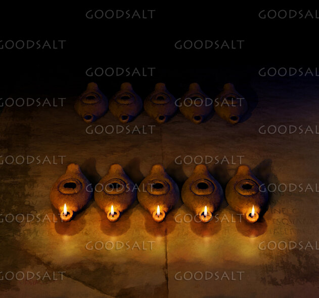 and went to meet the bridegroom.2 Five of them were foolish, and five were wise.3 For when the foolish took their lamps, they took no oil with them,4 but the wise took flasks of oil with their lamps.5 As the bridegroom was delayed, they all became drowsy and slept.6 But at midnight there was a cry, ‘Here is the bridegroom! Come out to meet him.’7 Then all those virgins rose and trimmed their lamps.8 And the foolish said to the wise, ‘Give us some of your oil, for our lamps are going out.’9 But the wise answered, saying, ‘Since there will not be enough for us and for you, go rather to the dealers and buy for yourselves.’10 And while they were going to buy, the bridegroom came, and those who were ready went in with him to the marriage feast, and the door was shut.11 Afterward the other virgins came also, saying, ‘Lord, lord, open to us.’12 But he answered, ‘Truly, I say to you, I do not know you.’13 Watch therefore, for you know neither the day nor the hour.