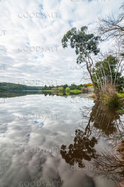 A perfect reflection of a dramatic sky and leaning tree at the edge of a peaceful lake. by Mal Austin