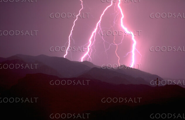 Bright lightning shooting down behind large mountains with cross in forefront by Michael Agliolo