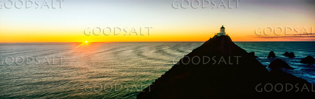 Dramatic sunrise and calm sea behind lighthouse and rocky islands. by Mal Austin
