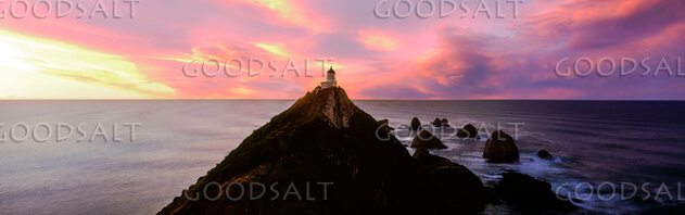 Dramatic sunrise and calm sea behind lighthouse and rocky islands. by Mal Austin