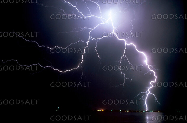 Lightning froks from the sky at night over a lake and small town. by John Clement