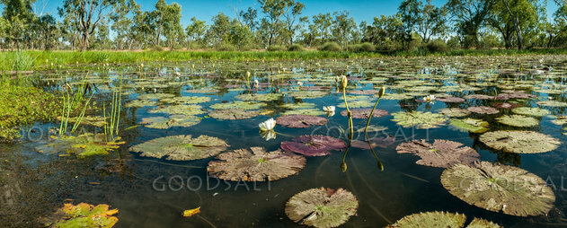 Lily covered billabong with reeds, leaves and lily flowers in calm shallow water. by Mal Austin