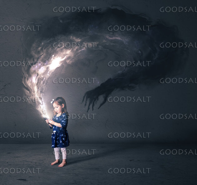 A little girl looks at a cell phone that has a dark monster by Kevin Carden