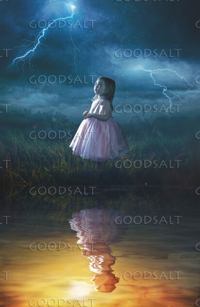 A little girl looking up at a rain storm while her reflection is in warm sunlight by Kevin Carden