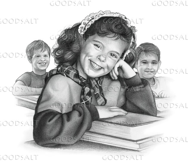 Little girls sits at school desk with two boys sitting behind her by Darrel Tank