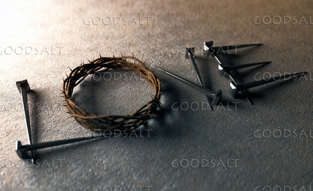 The word LOVE spelled with a crown of thorns and sharp metal nails. by Kevin Carden