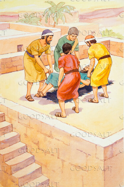 Four friends lower their crippled friend down through a torn-up roof to get him close to Jesus for healing. by Lifeway Collection