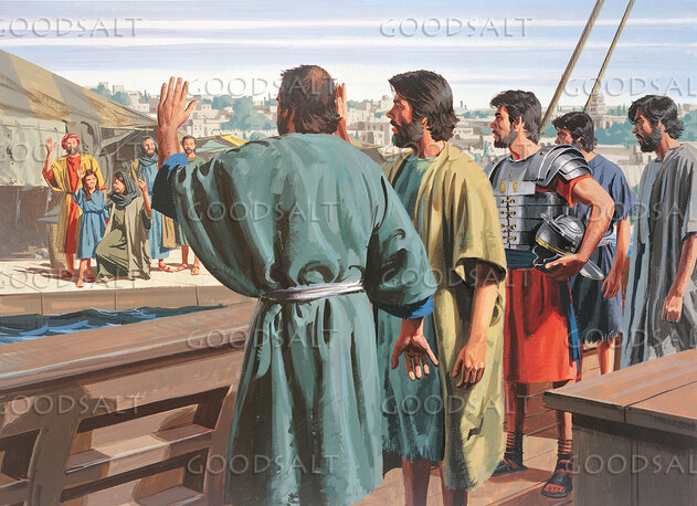 Paul and Luke have arrived at the harbor of Puteoli (Rome). They look to shore and are encouraged to find Christian friends who have traveled a great distance by land to greet them. by Lifeway Collection